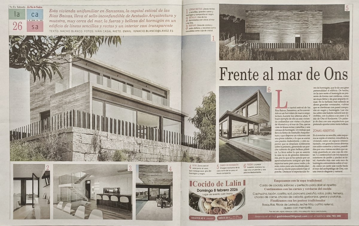 La capital estival de las Rías Baixas, Sanxenxo, se ha convertido en un hervidero de nueva arquitectura durante los últimos años. Y buen ejemplo de ello es esta vivienda unifamiliar con vistas a la playa de Montalvo y al mar de Ons, que se viste de líneas rectas y sencillas y una carcasa de hormigón.